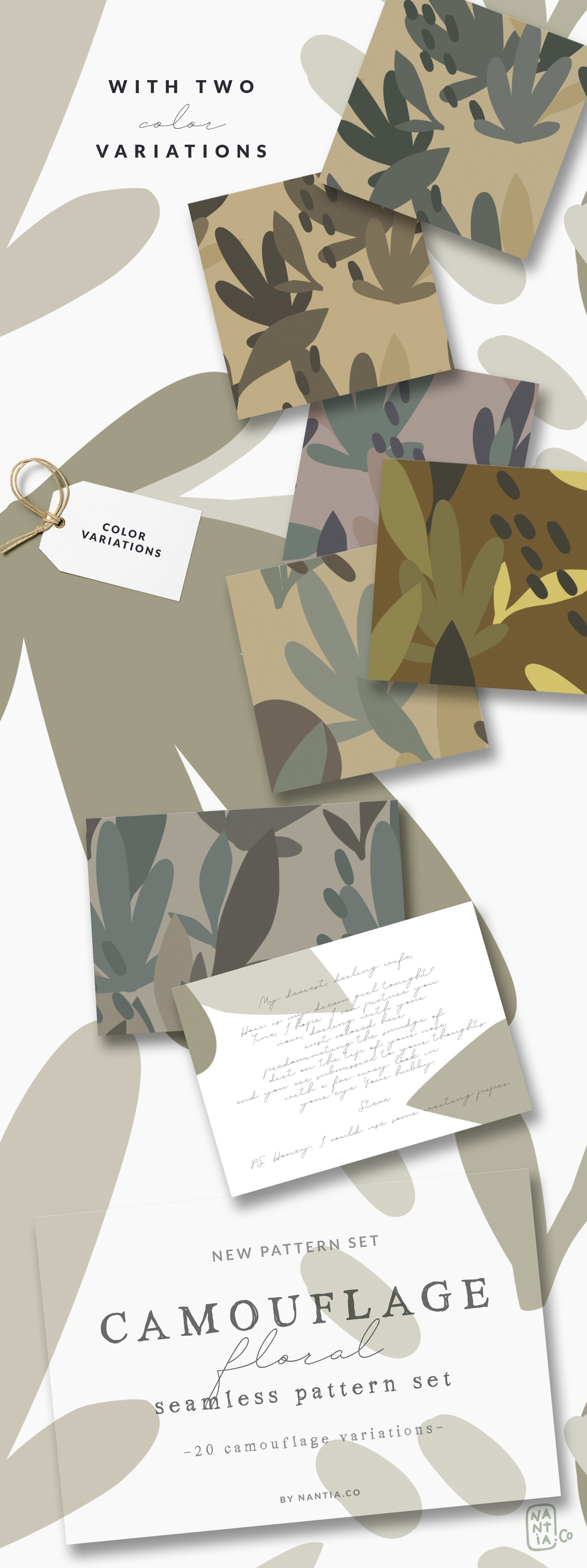 The Camouflage Floral Pattern Set includes 20 floral seamless pattern designs in camouflage color palette. This Pattern Set can be used in blog backgrounds, social media template backgrounds, wedding invitation designs, packaging, and textile designs. With this floral-style patterns, you can make spring graphics on the spot.