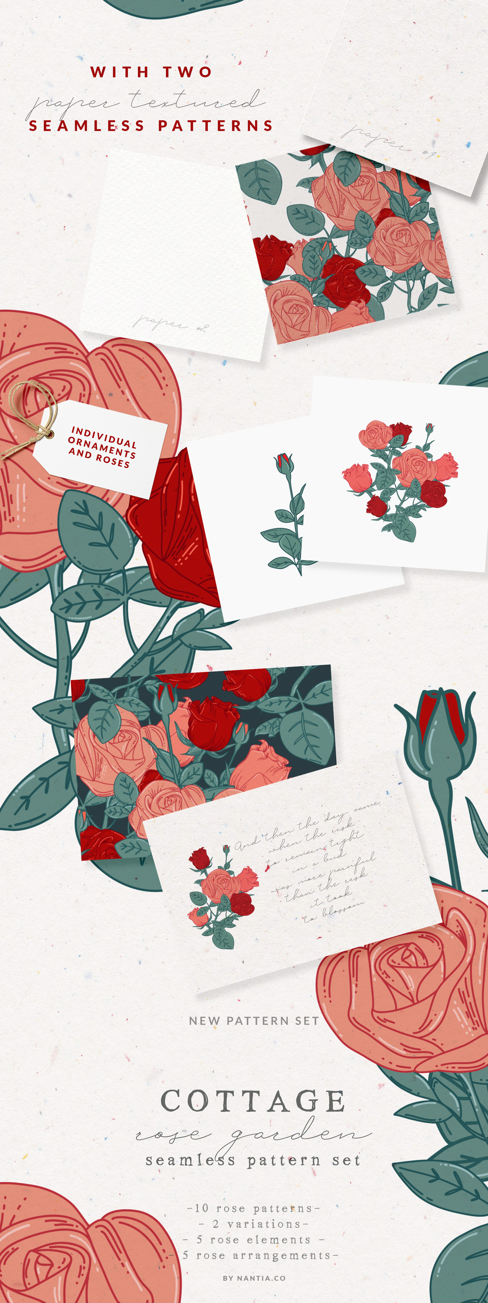 The Cottage Rose Garden Pattern Set includes 20 floral seamless pattern designs with roses and rose buds. With transparent background, so you can change the color of the background. This Pattern Set can be used in blog backgrounds, social media template backgrounds, wedding invitation designs, packaging and textile designs. With this floral-style patterns you can make spring graphics on the spot.