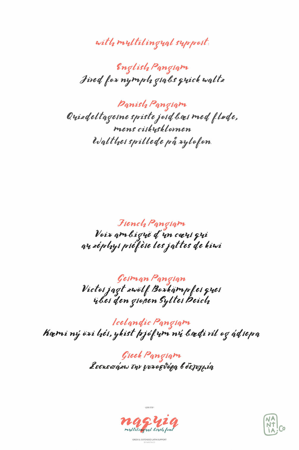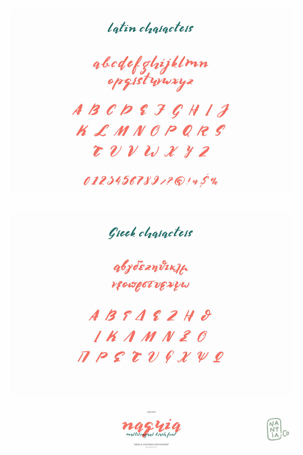 The Naquia Multilingual Brush font is a 100% handcrafted font with which you can achieve a handwritten-type lettering feeling.