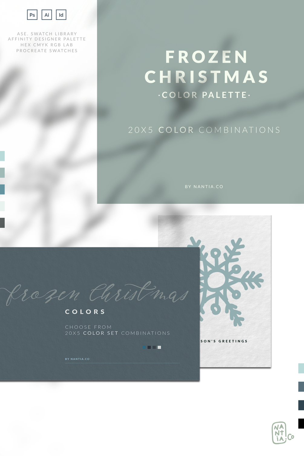 Pair Frozen Christmas colors with 20x5 color set combinations. The color palette includes 20x5 color collections for Illustrator, Photoshop, Indesign, and Affinity Designer.