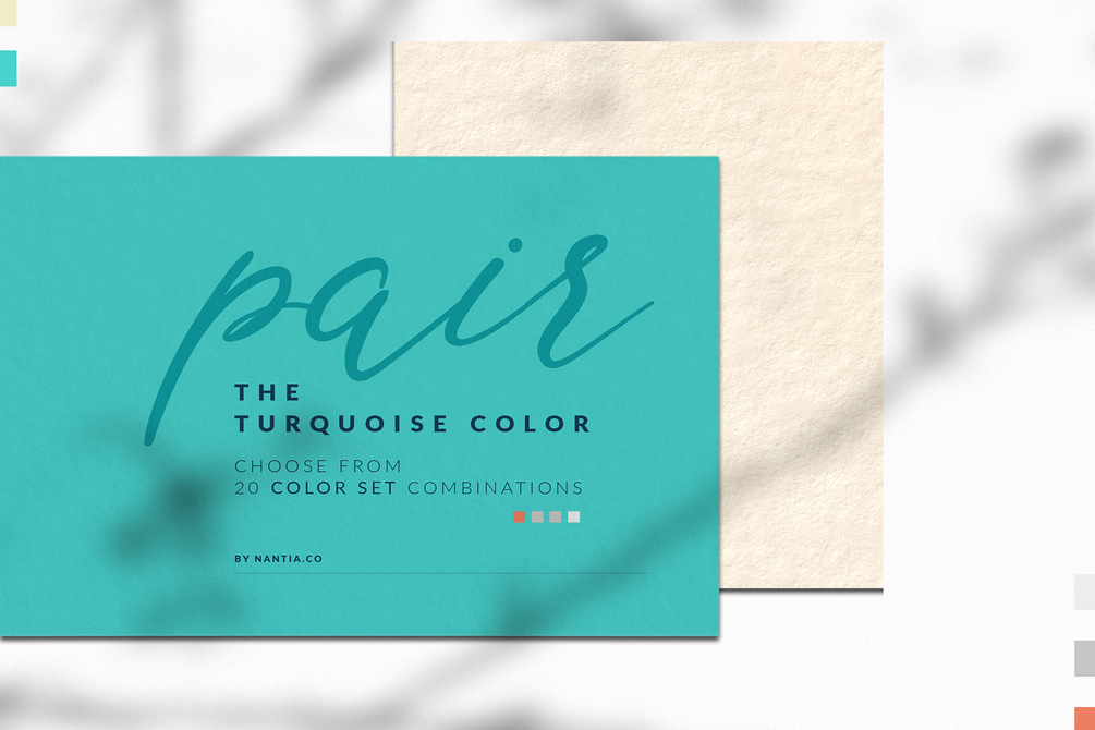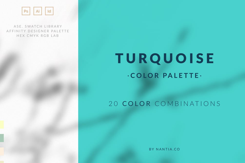 Pair turquoise color with 20x5 color set combinations. The color palette includes 20x5 color collections for Illustrator, Photoshop, Indesign, and Affinity Designer.